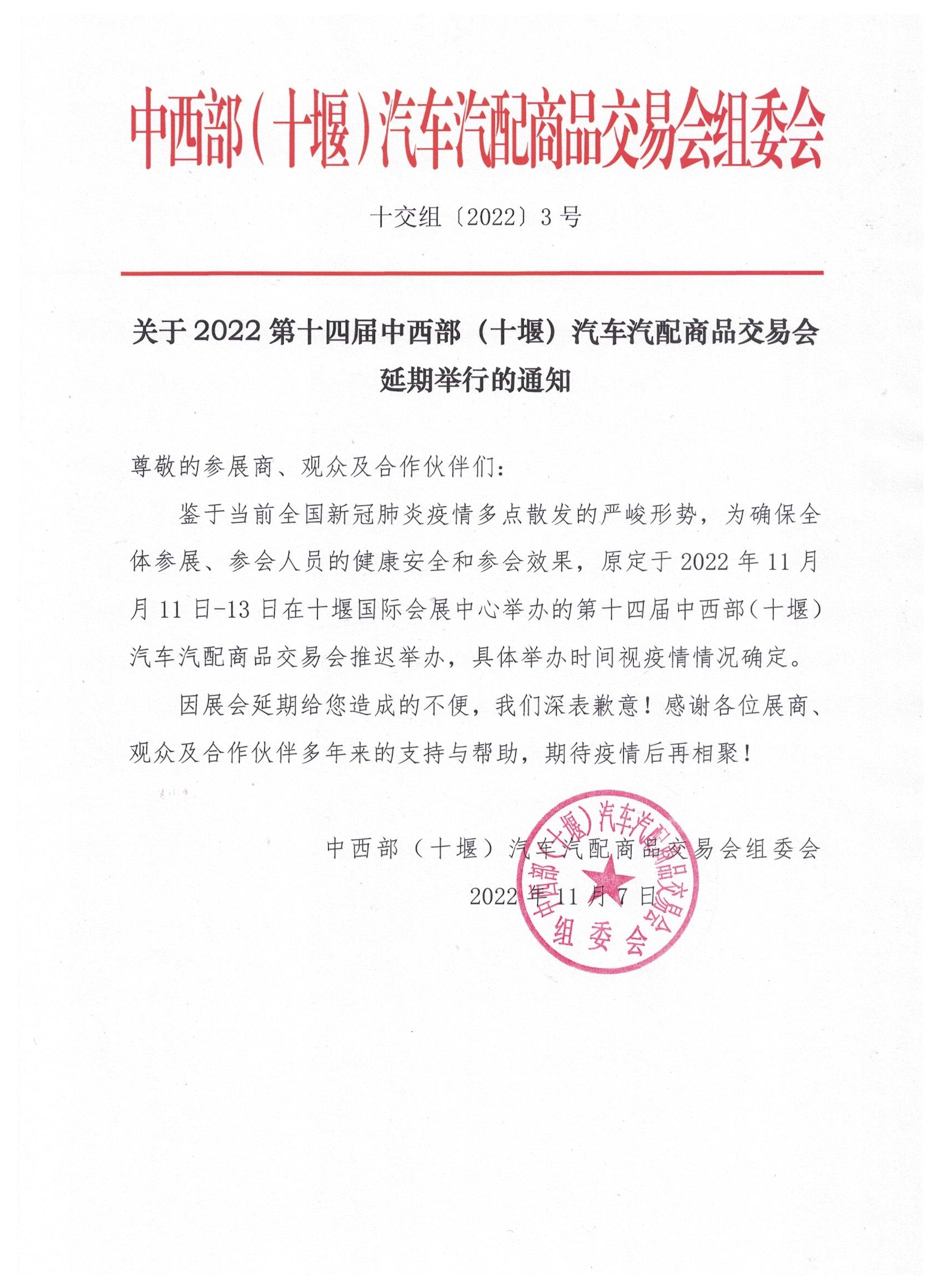 鉴于全国疫情形势严峻复杂,经组委会评估展会效果,原定于2022年11月11日-13日在十堰国际会展中心举办的第十四届中西部(十堰)汽车汽配商品交易会推迟举办,具体举办时间另行通知。因展会推迟给您带来的诸多不便,我们深表歉意!真诚感谢所有在特殊时期一如既往支持我们的展商、观众及合作伙伴。